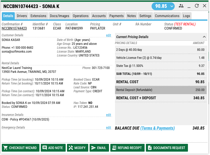Download and store copies of the rental agreement, insurance documents, renter documents, vehicle condition photos, integrated payments through EMV processors like Stripe & Worldpay, communications via email and SMS, and detailed logs of what agents did on each rental record.